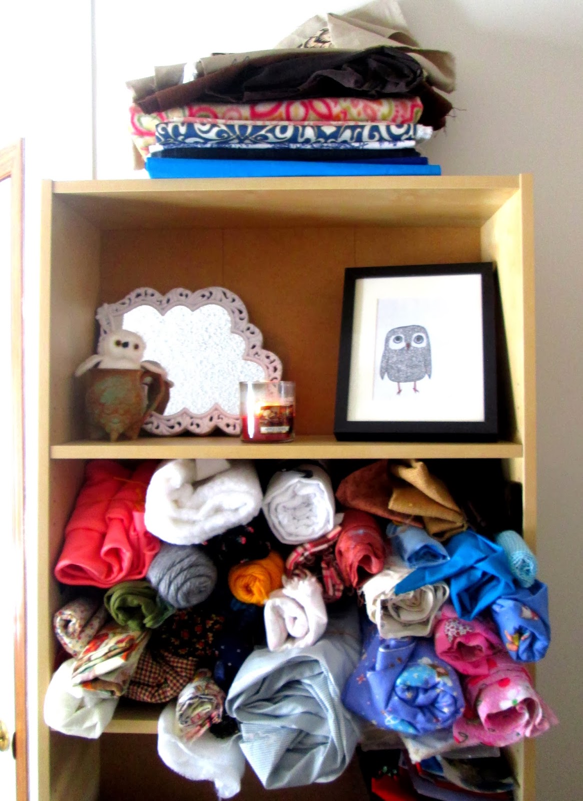 I've got a few piles of bigger sections of fabric stacked around or on top of shelves. These fabrics I use for my ongoing projects, or store fabrics that have been given to me. Sometimes it takes a while to get the proper inspiration for a print.